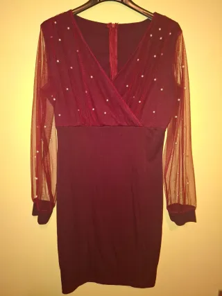 Elegante vestido de fiesta con manga larga de tul y detalles de perlas. - Diseño cruzado en el escote. - Mangas transparentes con perlas. - Largo hasta la rodilla.