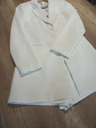 Precioso vestido estilo blazer con pantalones cortos incorporados. Es una prenda elegante y moderna, ideal para lucir a la moda. - Diseño tipo blazer. - Pantalones cortos integrados. - Color blanco.