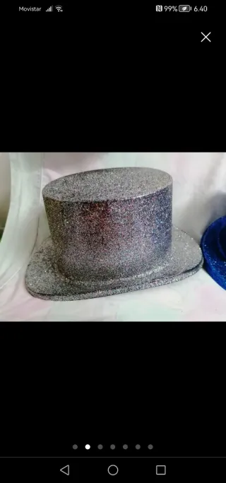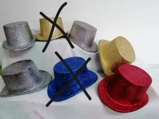 7 sombreros de copa de plástico duro, decorados con purpurina. 3 plateados, 2 dorados, 1 azul y 1 rojo. Precio individual 2€, precio por todos, 10€. Altura 13cm, largo 32cm y ancho 22cm. No hacer caso del tachado, están todos disponibles. Si quieres sólo uno, Pídemelo y genero un nuevo anuncio. 7 barrets de copa de plàstic, amb purpurina. Ideal per disfressar. Possibilitat de fer entregues en mà a Llagostera, Sils, Caldes Malavella, Vidreres i Sta Coloma de Farners.