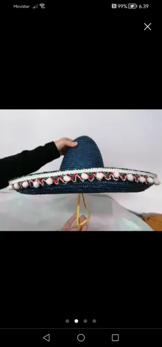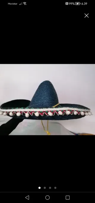 PREPARA TU CARNAVAL. Sombrero mejicano azul marino, con cinta multicolor y con pompones blancos en el margen. 55cm diámetro total. Con cordón de color amarillo para atar en la barbilla. Possibilitat de fer entregues en mà a Llagostera, Sils, Caldes Malavella, Vidreres i Sta Coloma de Farners.