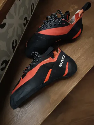 Pies de gato Five Ten en color negro y rojo. Diseñados para escalada. Solo tienen 1 uso - Cierre con cordones. - Detalle de logo en el lateral.