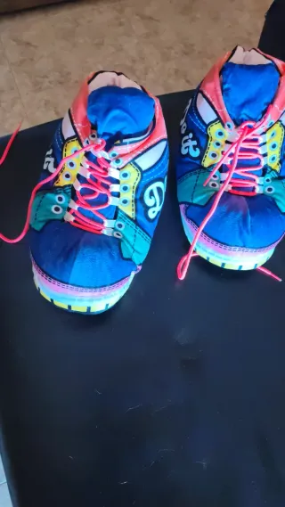 Zapatillas con un diseño llamativo y colorido, perfectas para usar en casa o como parte de un disfraz. - Estilo deportivo. - Cordones rosas. - Suela con detalles de colores.
