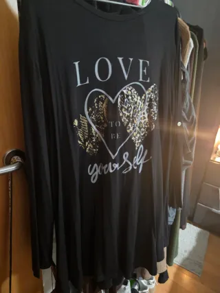 Jersey oversize con un diseño llamativo en el frontal. - Estampado de corazón con detalles dorados y efecto animal print. - Mensaje LOVE TO BE yourself en la parte delantera.