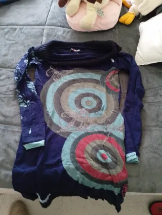 Vestido de punto con cuello alto y manga larga. - Diseño con círculos concéntricos en tonos azules, grises y rojos. - Detalle de mariposa bordada en la parte superior. - Puños y bajo con acabado festoneado.