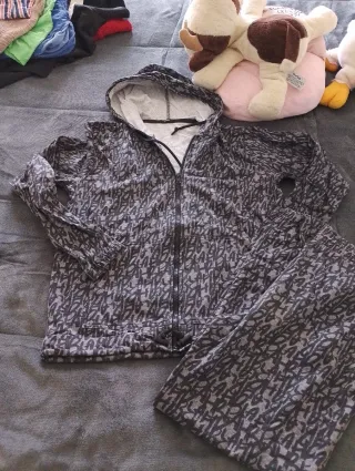 Conjunto de chándal para mujer con un diseño moderno. - Sudadera con capucha y cremallera. - Pantalón a juego. - Estampado de letras en gris y negro.