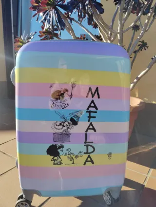 Conjunto de maleta y neceser con diseño de Mafalda. - Diseño de rayas multicolor. - Personajes de Mafalda impresos.