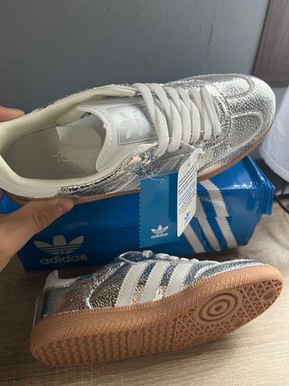 Zapatillas Adidas Samba con un diseño llamativo. - Acabado plateado brillante. - Detalles en blanco. - Suela de goma marrón. - nuevas con etiqueta