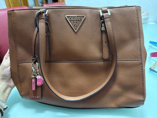 Vendo bolso Guess en color marrón. Está algo desgastado como se puede ver en las fotos. - Logo metálico de Guess en la parte frontal. - Cierre de cremallera. - Bolsillo exterior. - Dos asas. - Incluye llaveros decorativos.