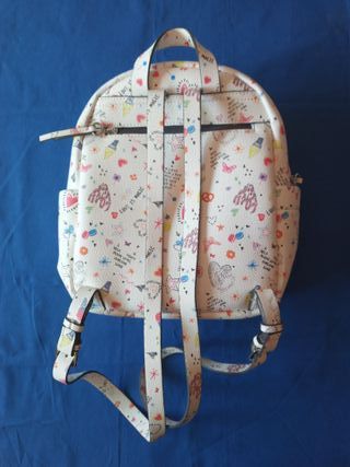 Mochila pequeña marca Parfois. Tiene un compartimiento para tablet, y viene con el llavero monedero en forma de corazón como se ve en la foto. Está como nuevo.
