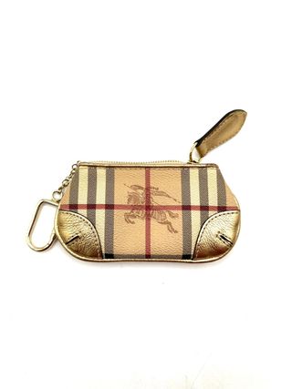 Monedero Burberry con estampado Check en tonos beige y detalles en cuero dorado metalizado, compacto y funcional. Medidas 14 × 8 cm. Diseño con cierre de cremallera superior y gancho metálico lateral, ideal para usar como llavero o colgar del bolso. Destaca el logo ecuestre Burberry en el frontal y interior forrado. Buen estado, con signos visibles de uso en las esquinas metálicas, sin afectar su funcionalidad. Un clásico de la firma británica fundada en 1856. Barcelona 0387