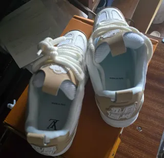 Zapatillas Louis Vuitton en color beige y blanco. - Diseño moderno y urbano. - Detalles de la marca. - Incluye etiqueta y llavero.