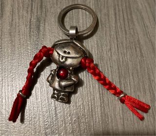 Llavero con figura de plata vieja de una niña con trenzas rojas. - Figura de plata. - Trenzas de hilo rojo. - Detalle de gema roja en el pecho.