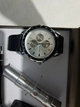 Elegante set de regalo que incluye un reloj con correa de cuero, un bolígrafo y un llavero. - Reloj con esfera plateada y detalles plateados. - Bolígrafo negro con detalles plateados. - Llavero con detalle de cuero negro y placa plateada.