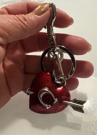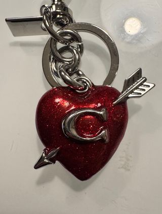 Este encantador llavero con forma de corazón flechado es un accesorio llamativo. - Diseño de corazón rojo brillante. - Detalle de flecha plateada. - Inicial C plateada en el centro.