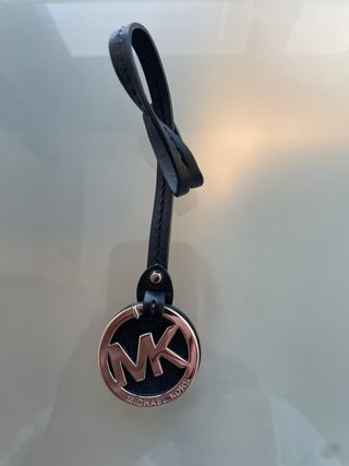 Este accesorio de Michael Kors combina elegancia y funcionalidad. - Diseño circular con el icónico logo MK. - Acabado metálico en tono plateado - Correa de cuero negro.
