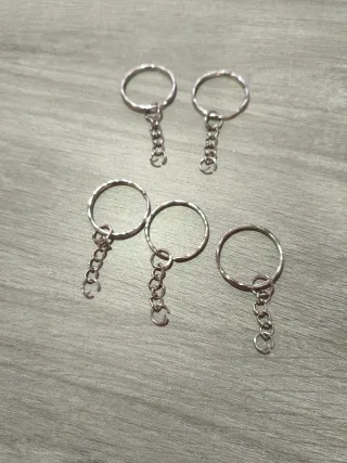 5 cadenas para llaveros con un acabado plateado. - Cada cadena tiene un aro principal. - Incluye eslabones para colgar adornos. - Diseño con textura en el aro principal. 5 unidades 1€ Dispongo de mas unidades