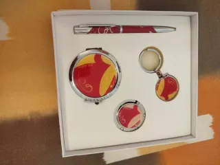Conjunto de bolígrafo, espejo, llavero y colgador bolso, con un diseño elegante. - Bolígrafo con detalles en rojo y plateado. - Llavero a juego.
