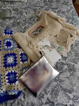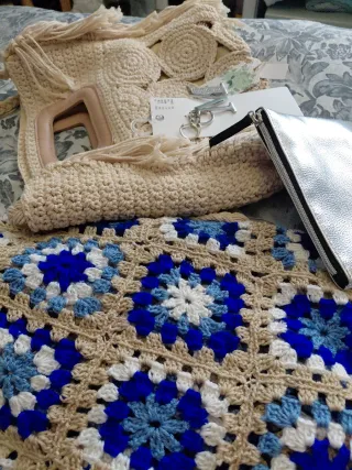 Conjunto de prendas y accesorios de crochet. - Chaleco de crochet con flecos. - Llavero con detalle de letra. - Bolso de mano plateado.