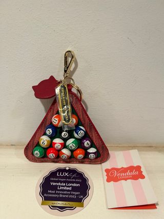 Llavero de Vendula London con diseño de triángulo de billar. Incluye un detalle de gato. - Llavero con forma de triángulo de billar. - Detalle de gato en color rojo. - Incluye etiqueta de Vendula Breweries.