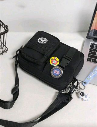 Práctica mochila de hombro con un diseño moderno y detalles colgantes. - Cierre principal con cremallera. - Bolsillo frontal con malla. - Correa ajustable. - Incluye llaveros decorativos.