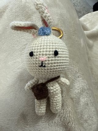 Adorno de crochet con forma de conejito, ideal para colgar en bolsos o usar como llavero. - Diseño de conejo tejido a mano. - Pequeño bolso marrón cruzado. - Orejas con interior rosa. - Detalle de lazo azul. -Se entrega con la bolsita de Zara