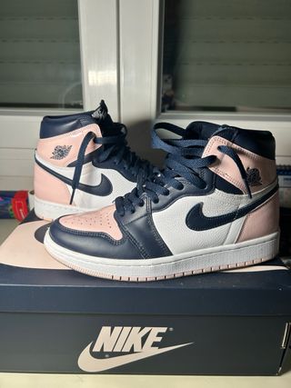 Air Jordan 1 rosa y azul. Compradas en la página oficial. Talla 39, me quedan pequeñas. Solo tienen un uso literalmente salí un día con ellas y no me las pude volver a poner. Son originales (ver marca de autentificacion en la suela foto 4. Les compré un plástico protector a la suela por si me las volvería a poner, que no fue el caso. Se puede quitar si queréis, lo que me sobró lo envío también. Traen dos cordones: blanco y rosa, además del que está puesto ya y un llavero LO ENVÍO CON TODO MÁS LA CAJA