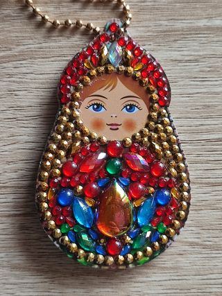 Llavero de matrioska. Mide unos 7 cm. Ideal para llevarlo con las llaves o colgado de un bolso. Está hecho a mano. Los brillantes los lleva por delante y por detrás
