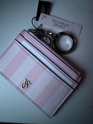 Tarjetero con un diseño de rayas en rosa y blanco. Incluye un llavero. - Diseño de rayas. - Llavero incluido. - Logo de Victoria's Secret. guarda las tarjetas y las llaves juntas. cualquiera que quiera organizarse con comodidad. El encantador estampado de corazones le da un toque cariñoso a este práctico estuche. 4,50" de ancho x 3" de alto Incluye cuatro ranuras para tarjetas Se puede colocar en bolsos tote y mochilas pero también se puede usar por separado como llavero