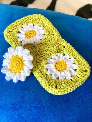 Conjunto de llavero y funda hechos a mano con un diseño de margaritas. - Llavero con forma de margarita. - Funda tejida con motivos de margaritas. - Llavero solo: 5 € - Funda sola: 15 €