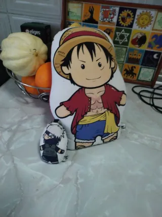 Set de cojín y llavero con diseño de anime. - Cojín con personaje de One Piece. - Llavero con personaje de Naruto. - Ideal para coleccionistas y fans del anime.