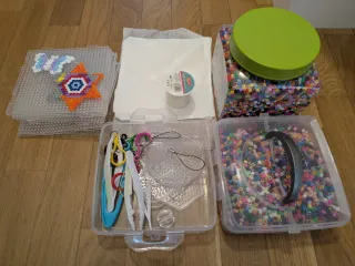 Kit para crear manualidades como pulseras, llaveros y figuras. - Incluye planchas para hacer diseños. - Pinzas y accesorios para manipular las piezas. - Variedad de cuentas de colores.