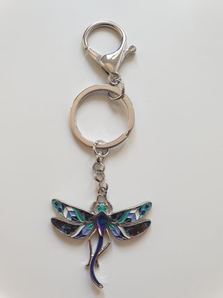 Llavero con bolas de cristal azul, acero inoxidable, y terminado en pequeños abalorios azules. Mide, contando el aro, 13 cm.