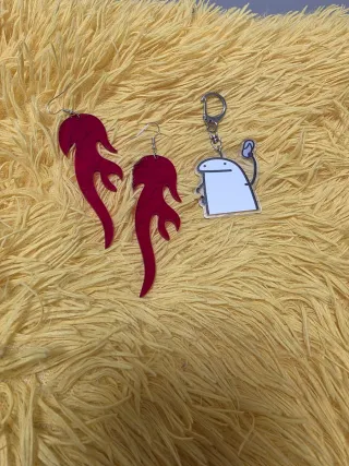 Conjunto de bisutería que incluye un par de aretes y un llavero. - Aretes con diseño de llamas en color rojo. - Llavero con figura de personaje blanco.