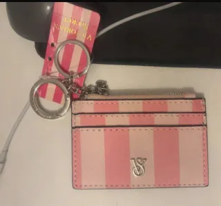 Tarjetero monedero con el icónico diseño de rayas de Victoria's Secret. - Diseño a rayas en rosa y blanco. - Incluye llavero. - Pequeño bolsillo con cremallera.