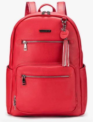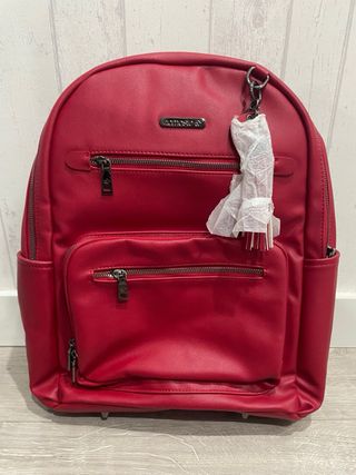 Mochila de piel en color rojo, con un diseño moderno y práctico. - Compartimento principal con cierre. - Bolsillo frontal con cremallera. - Bolsillos laterales. - Detalle de llavero con borla. La mochila de Namaste Maker de diseño consciente ha sido diseñada para artesanos con viajes en mente. Hecho de cuero vegano, este accesorio producido conscientemente es imprescindible, con características innovadoras que exudan prácticamente para aquellos que disfrutan elaborando en marcha.