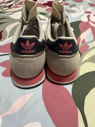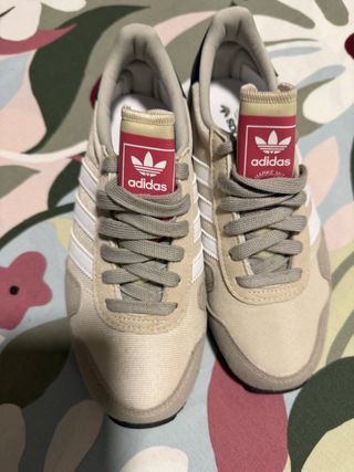 Zapatillas de la marca Adidas en tonos beige y blanco. - Diseño deportivo. - Tres rayas blancas características de la marca.