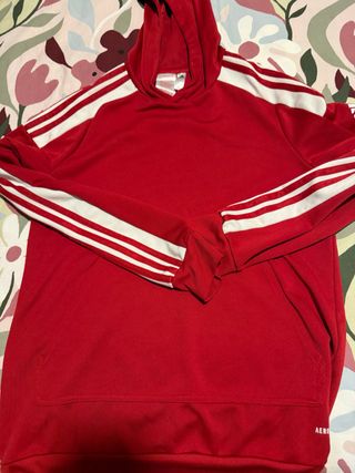 Sudadera con capucha de Adidas en color rojo. Presenta las icónicas tres rayas blancas en las mangas y los hombros. - Diseño con capucha. - Bolsillo frontal tipo canguro. - Detalle de rayas deportivas en mangas.