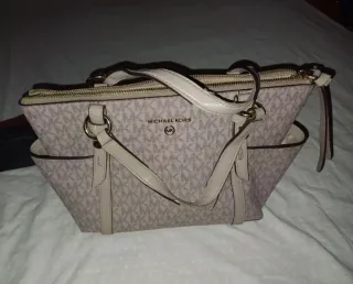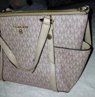 Bolso de la marca Michael Kors con un diseño elegante. - Patrón MK distintivo. - Detalles en piel. - Cremallera superior dorada. - Bolsillo exterior. Las asas tienen algunos usos de desgaste.