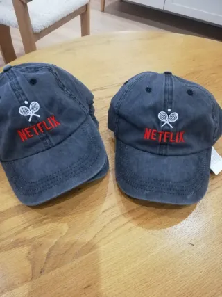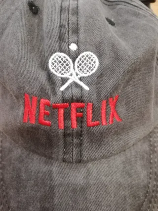 Gorra con diseño de tenis y el logo de Netflix. - Color gris con detalles en rojo. - Bordado de raquetas de tenis y pelota. 7 disponibles. Todas por 4 euros cada una 25 euros todas