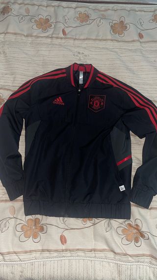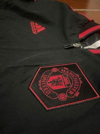 Chaqueta deportiva del Manchester United Original, talla S. Diseño en color negro con detalles en rojo.