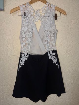 Mono elegante de dos tonos, con la parte superior blanca y la inferior negra. - Diseño cruzado en la parte superior. - Detalle de encaje en la espalda. - Corte tipo short en la parte inferior.