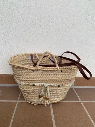 Bolso de mano de paja con un diseño natural y veraniego. Cuenta con asas de cuero y detalles decorativos de cuentas de madera. - Material: Paja - Asas: Cuero - Adorno: Cuentas de madera