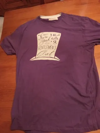Camiseta de manga corta de la marca Springfield talla L con un diseño gráfico en la parte delantera - Diseño inspirado en un club de caballeros de Nueva York - Estampado en color crema sobre fondo morado - Cuello redondo