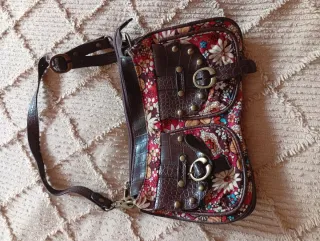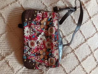 Bolso de piel con un diseño floral vibrante y detalles en imitación de cocodrilo. - Estampado floral multicolor sobre fondo marrón. - Acabados en imitación de piel de cocodrilo en los bordes. - Remaches metálicos decorativos en las esquinas.