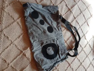 Bolso artesanal confeccionado con tela vaquera. - Diseño único. - Cierre de botón a presión. - Correa ajustable.