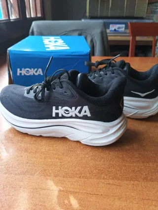 Zapatillas Hoka Clifton 10 en color negro y blanco. Diseñadas para ofrecer comodidad y rendimiento. -Totalmente nuevas a estrenar. - Parte superior de malla transpirable. - Entresuela de espuma para amortiguación. - Suela de goma duradera.