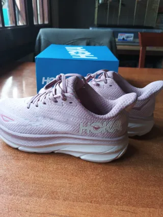 Zapatillas Hoka Clifton 9 en color rosa y blanco. - zapatillas para correr - Totalmente nuevas a estrenar. - Diseño moderno y ligero. - Detalle del logo Hoka en el lateral.