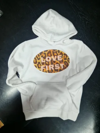 Talla 7/8 Sudadera blanca con un llamativo estampado de leopardo en forma ovalada en el pecho. - Diseño ovalado con estampado de leopardo. - Texto LOVE FIRST en el estampado. - Bolsillo frontal tipo canguro.