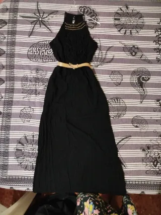 Elegante vestido largo negro de Stradivarius. Presenta un diseño con cuello halter y detalles adornados en la parte superior, además de un cinturón a juego. - Diseño con cuello halter. - Adornos en el cuello. - Incluye cinturón.
