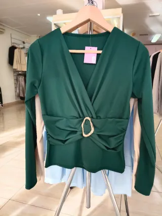 Elegante blusa de manga larga con un diseño cruzado y un detalle metálico dorado en la cintura. - Manga larga. - Escote en V. - Detalle de hebilla dorada. - Diseño fruncido.